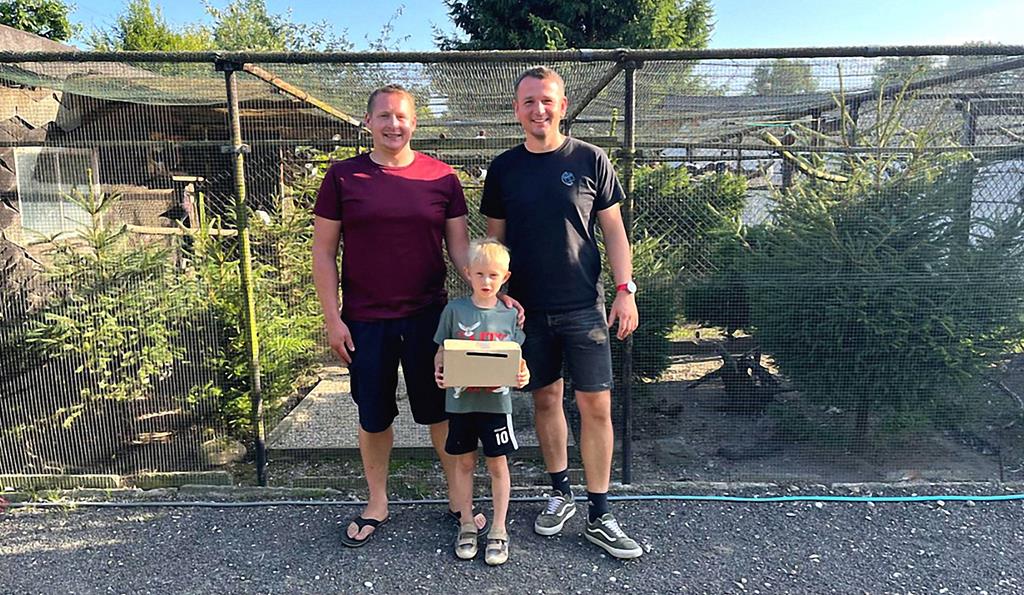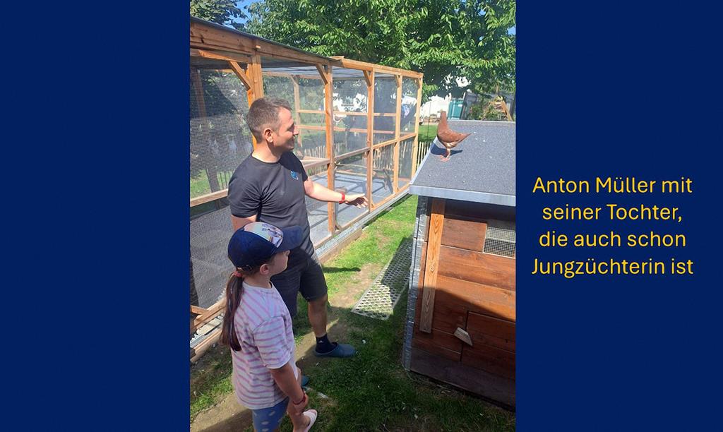 Ziel Nummer eins war in Taucha bei Leipzig Anton Müller und seine Familie. Der Name Anton Müller mit seinen rezessiv rot-hellschildig-gesäumten Gazzi wurde spätestens auf der HSS 2024 in Schönbach deutschlandweit bekannt. Wir erinnern uns: V97 Champion auf eine junge Täubin. Außerdem war zu Lebzeiten sein Großvater Jahrzehnte Mitglied im SV und aktiver Züchter/Aussteller. Seit diesem Jahr ist Anton Müller auch Preisrichter.