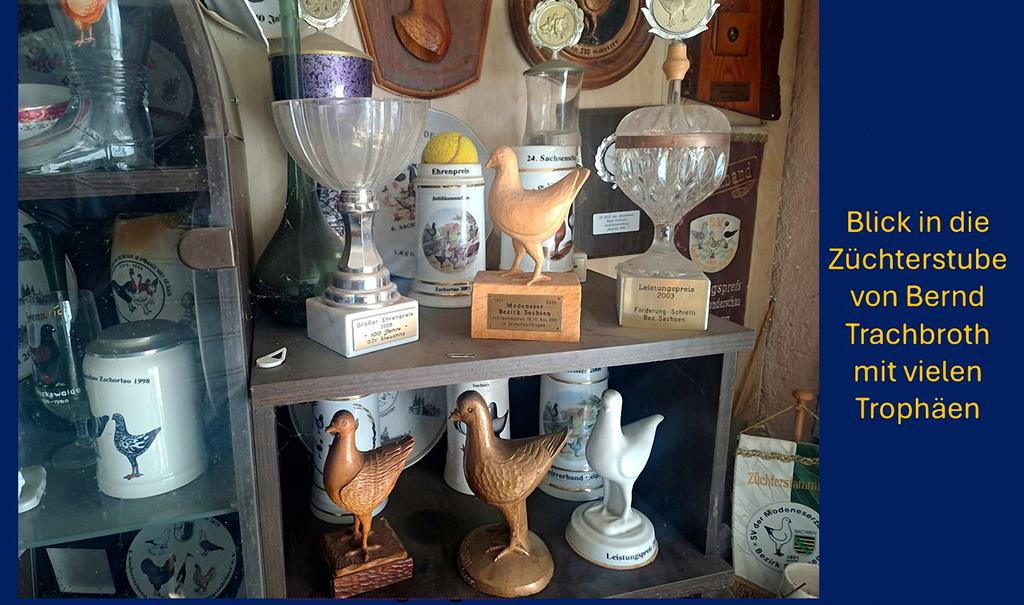 Vor der Tür bei Cholewas konnten wir das Auto stehen lassen und liefen die wenigen Schritte bis zum Haus von Familie Trachbrodt. Was dann folgte war ein weiterer Höhepunkt des Tages. Bernd Trachbrodt und Martin Zerna waren gemeinsam einst junge Sonderrichter, junge Vorstandsmitglieder und in ihren Epochen wichtig für die Modeneserzucht. Wir heute jüngeren Züchter konnten nur zusehen, wie sich die beiden „Alten“ in 100jährigen SV-Dokumenten vergruben und Erinnerungen austauschten. Frau Trachbrodt stellte Kaffee und Kuchen auf den Tisch. Über eine Stunde war inzwischen vergangen und noch keine einzige Taube bei Bernd angesehen. So konnte es nicht weiter gehen. Also hoch und die Tauben mustern. Schwarze Gazzi sind die „Hausmarke“ von Bernd seit 1990. Davor waren es schöne gelbe Schietti. Die Auswahl an Schwarzen Gazzi ist groß. Auf die Schausaison kann Bernd Trachbrodt beruhigt warten. Einzig, es sind allerhand Gazzi zu putzen. Das macht ihm aber Spaß, sagte er.