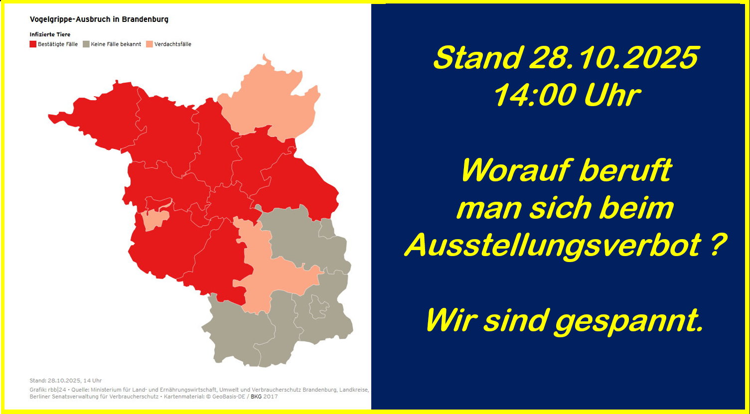 Der konkrete Erlass wird am Nachmittag veröffentlicht, sobald das geschieht, wird es hier aufgezeigt. Toralf Golzbuder wurde mitgeteilt, dass auf der Schau in Eichow am Wochenende kein Geflügel ausgestellt werden darf. Es sollen einzelne verendete Wildvögel gefunden worden sein, die jetzt untersucht werden. Präventiv wurden die Stallpflicht und die Ausstellungssperre angeordnet. Das wäre auch für die Vereinsschau des KTZV am 13.-14.12.2025 schon so festgelegt. Damit könnte unsere Vereinsschau 2025, die dort angeschlossen ist, nicht stattfinden. Auf Nachfrage beim Veterinäramt wurde mir gesagt, das wäre aber abhängig vom weiteren Verlauf der Seuche.