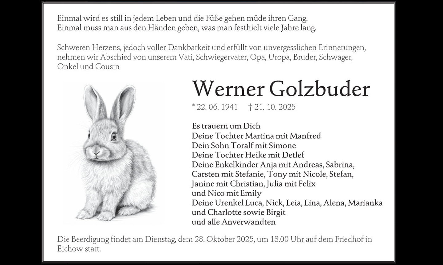 Die Beerdigung findet am Dienstag, 28.10.2025 um 13:00 Uhr auf dem Friedhof in Eichow statt.