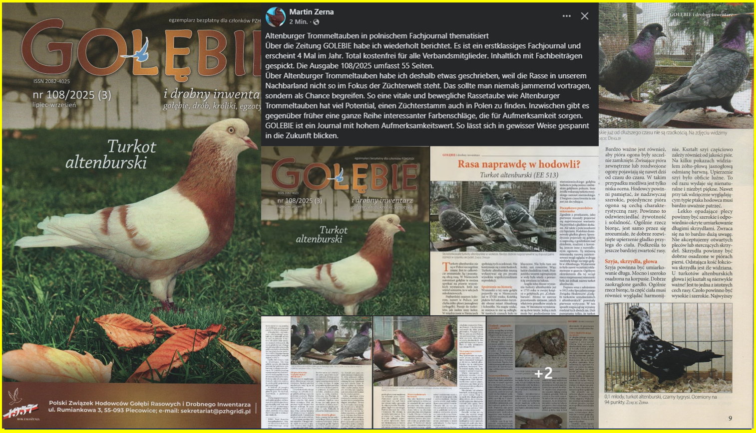 Über die Zeitung GOLEBIE habe ich wiederholt berichtet. Es ist ein erstklassiges Fachjournal und erscheint 4 Mal im Jahr. Total kostenfrei für alle Verbandsmitglieder. Inhaltlich mit Fachbeiträgen gespickt. Die Ausgabe 108/2025 umfasst 55 Seiten. Über Altenburger Trommeltauben habe ich deshalb etwas geschrieben, weil die Rasse in unserem Nachbarland nicht so im Fokus der Züchterwelt steht. Das sollte man niemals jammernd vortragen, sondern als Chance begreifen. So eine vitale und bewegliche Rassetaube wie Altenburger Trommeltauben hat viel Potential, einen Züchterstamm auch in Polen zu finden. Inzwischen gibt es gegenüber früher eine ganze Reihe interessanter Farbenschläge, die für Aufmerksamkeit sorgen. GOLEBIE ist ein Journal mit hohem Aufmerksamkeitswert. So lässt sich in gewisser Weise gespannt in die Zukunft blicken.